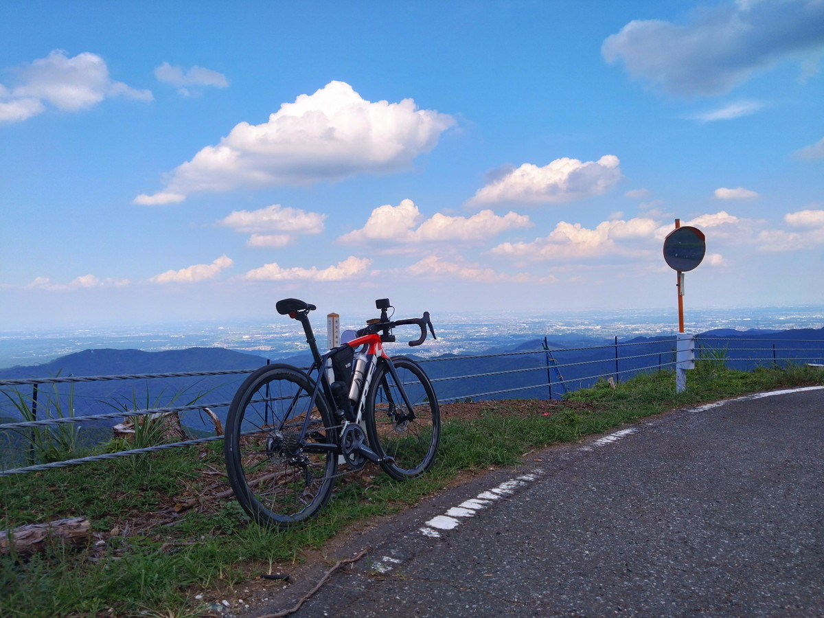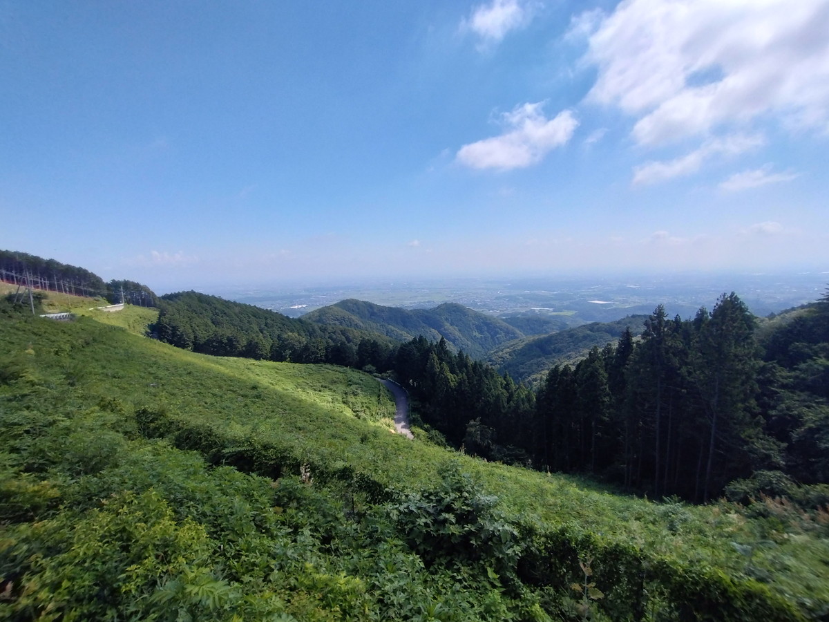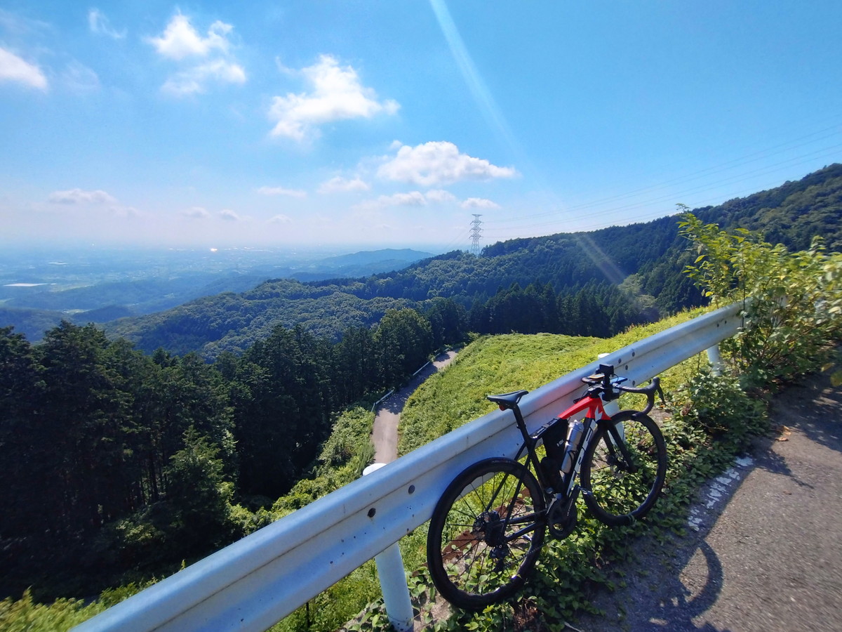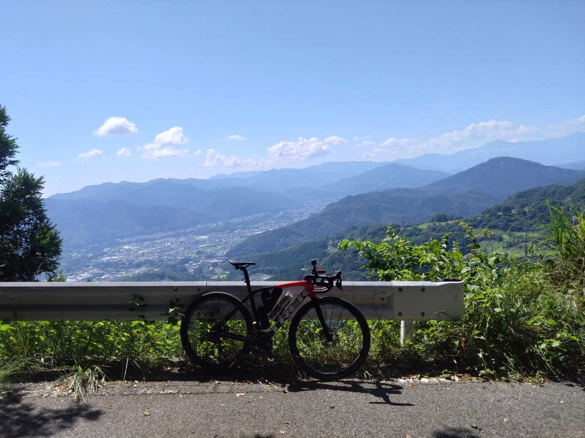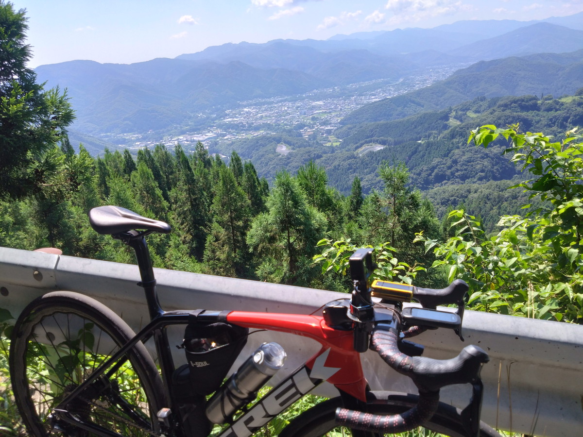 今日のルートはこの後に正面に見える秩父市街まで降りて左側の山に上り返すのですが、秩父盆地の夏の昼間は暑いんです。