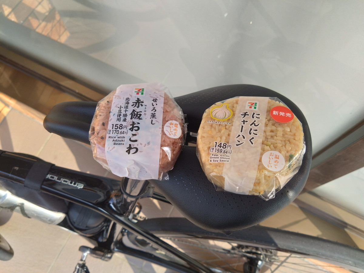 8時5分、コンビニで朝飯を食いながらオープニング動画を撮ります。
